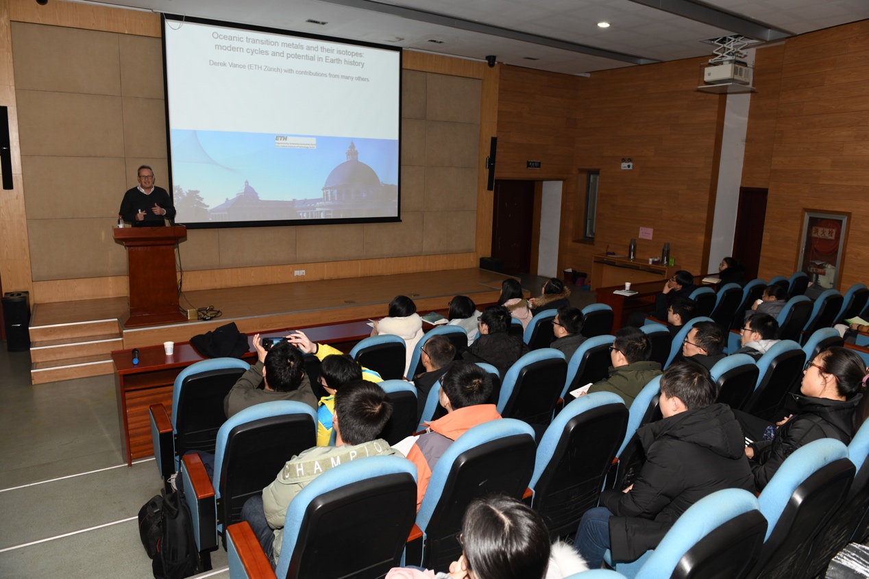 1月11日,应地球和空间科学学院邀请,欧洲地球化学学会副主席、瑞士联邦理工Derek Vance教授做客中国科大“赵九章•侯德封大师讲堂”,在环境资源楼报告厅作了题为“Oceanic transition metals and their isotopes: modern cycles and potential in Earth history (过渡金属元素的丰度和同位素在现代海洋中的循环及其在研究地球历史中的潜在应用)”的精彩学术报告。报告会由沈延安教授主持,他对Derek Vance教授作了介绍并表示热烈欢迎。