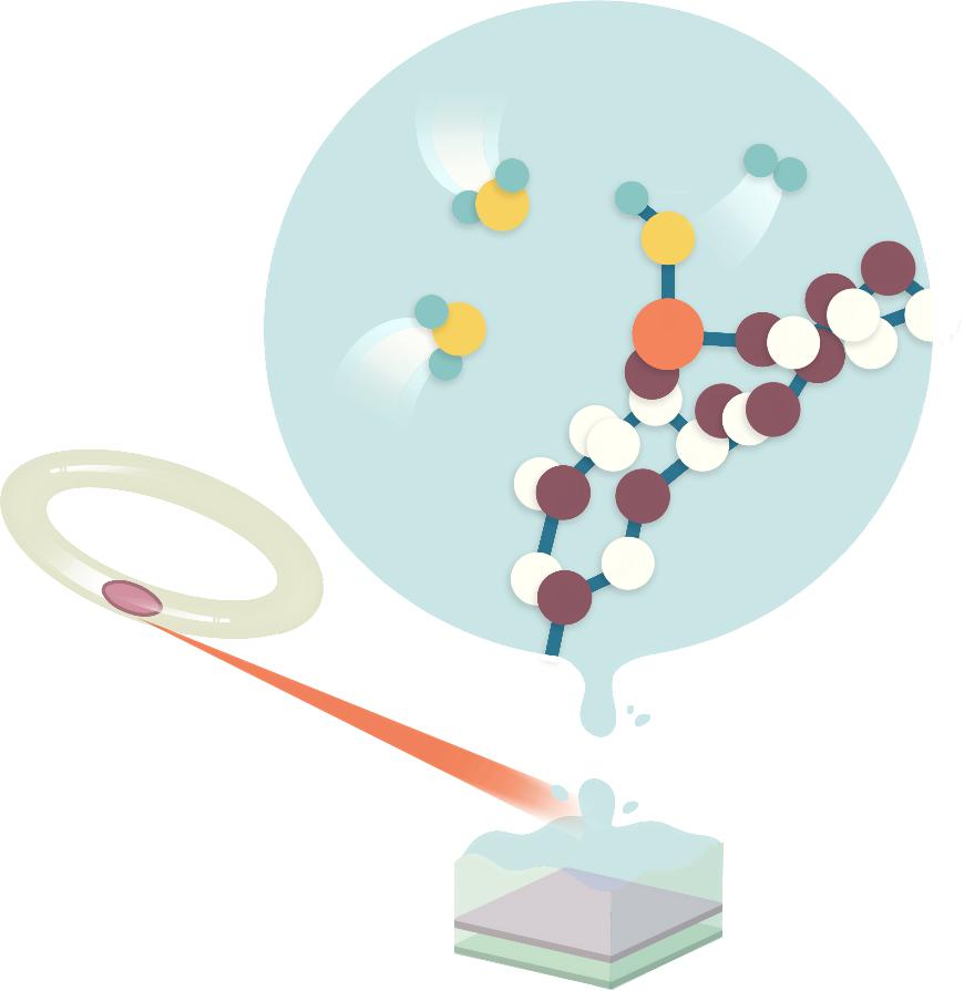 图片说明:催化材料(下)帮助水分子分解出氢分子,同步辐射储存环中引出来一束电子束(图左),照在材料反应的表面,将这个过程精细反映出来,即图片上方的水滴中催化材料活性位发生的水解氢过程。/美术设计:崔劼