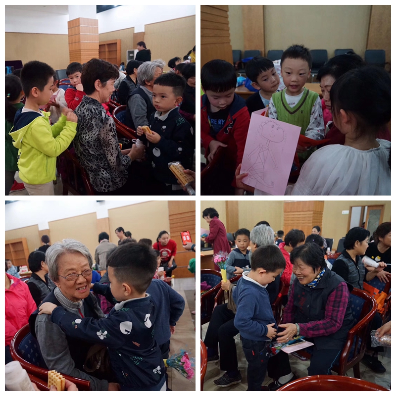 奶奶们都拥有丰富的幼儿教育经验,小朋友们很快就和奶奶们玩成一片,有的小朋友们和奶奶分享小零食,有的小朋友给奶奶们讲解自己制作的卡片,还有的小朋友给奶奶捶背、捏肩……。孩子们简单的问候已化作滋润奶奶们心田的甘露,唤起了她们对幼教生涯的回忆,唤起了她们对天伦之乐的共鸣,更唤起了她们对孩子、对学校的“大爱”。