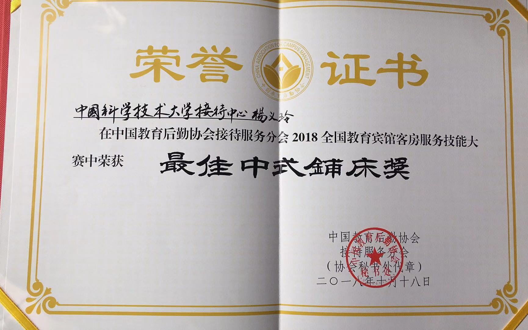本次大赛共有清华大学、中国人民大学、武汉大学、山东大学、同济大学等43所高校派出57名选手参加。比赛包括仪容仪表、口答试题、标准中式铺床、开夜床四个项目。我校接待中心派出专家楼客房部服务员杨义玲和王绘2位选手参赛。经过激烈的比赛角逐,杨义玲获得了最高奖项“特金奖”和“最佳中式铺床奖”,王绘获得了“金奖”。专家评委们对中心选手从容的临场表现和高水平的发挥给予了高度好评和赞扬。