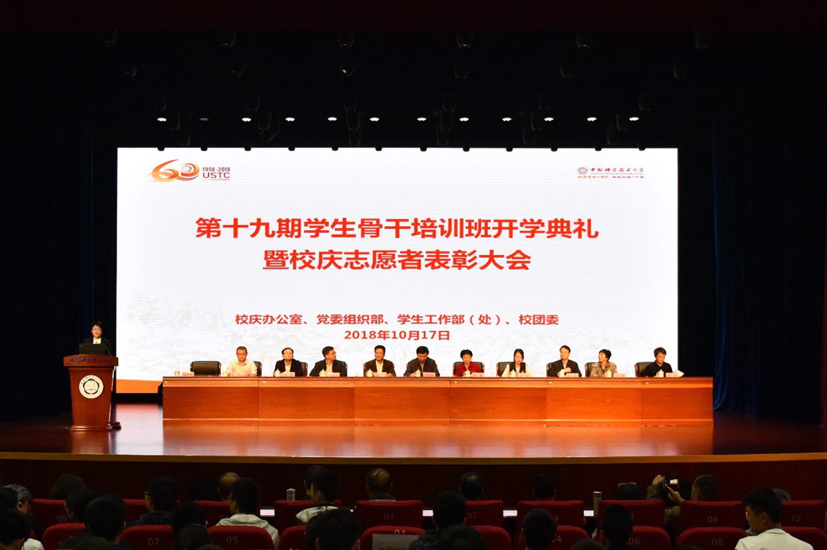 10月17日下午,我校在东区大礼堂举行第十九期学生骨干培训班开学典礼暨校庆志愿者表彰大会。校党委书记舒歌群、团省委副书记张敏、校党委副书记蒋一出席会议,参加会议的还有校庆办、组织部、学生工作部(处)、离退办、校团委、团省委学校部等部门负责人,院系团组织负责人和2018级本科生、研究生班主任、第十九期学生骨干培训班全体学员和全体优秀校庆志愿者。大会由校团委书记杨晓果主持。