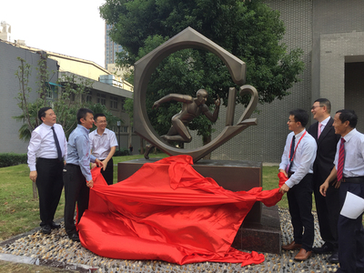 最后,参会领导和校友嘉宾共同为“跨越”铜雕揭幕,并在铜雕前合影留念。