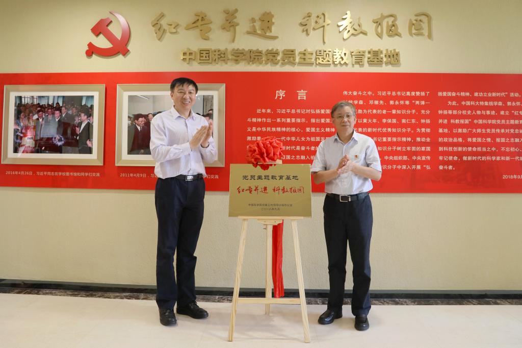 9月12日上午,我校“红专并进、科教报国”中科院党员主题教育基地揭牌仪式在校史馆三楼举行。中科院党组副书记、副院长侯建国,校党委书记舒歌群,中科院直属机关党委常务副书记李和风,以及我校在校党员校领导,各学院、实验室党组织负责人,老党员代表,近三年新发展的教工党员代表,学生党员代表等100多人参加了揭牌仪式。