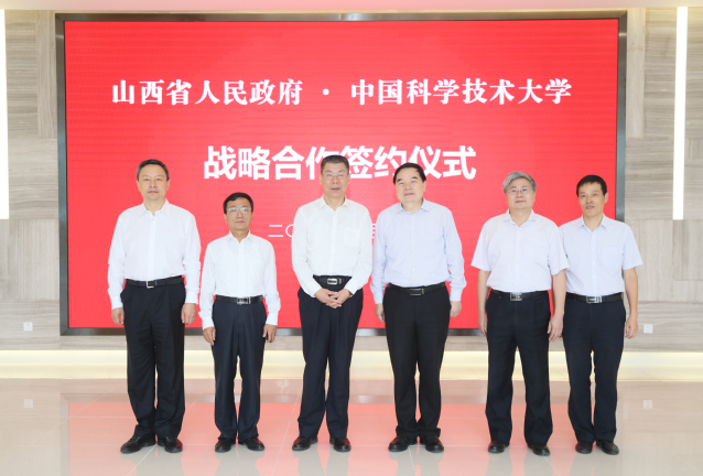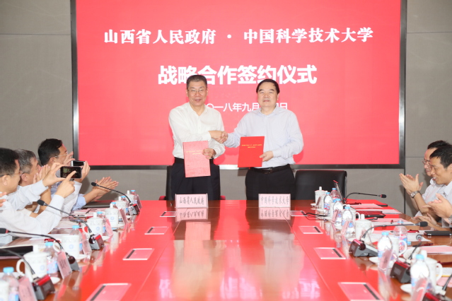 9月14日,山西省人民政府-中国科学技术大学战略合作协议签约仪式在我校物质科研楼科教展厅会议室举行,校长包信和院士与山西省副省长张复明代表双方签署战略合作协议。签约仪式由校党委常委、副校长朱长飞主持。参加签约仪式的还有山西省政府副秘书长丁纪岗、教育厅厅长吴俊清、教育厅副厅长级督学孙世新、经信委副主任卢秋生、科技厅副巡视员秦太龙、人社厅副厅长王建文、山西大学党委书记师帅、太原理工大学校长黄庆学院士以及相关部门领导,学校组织部、发展和改革办公室、学位办、招生就业处、教务处、科研部、人力资源部等相关职能部门以及火灾科学国家重点实验室、科技史与科技考古系负责人。