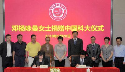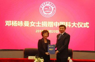 邓杨咏曼女士祝贺中国科大建校60周年,并表达了心系祖国、心系教育事业的爱国情怀。她说,从商30年来,一直关心祖国的教育事业,对邓稼先、郭永怀、杨振宁等科学家十分敬佩。60年来,中国科大为国家培养了一大批优秀人才,取得了令人瞩目的科研成果,为国家科教事业发展做出了重要贡献。此次能捐赠中国科大,既是一种荣誉,更是一份美好的祝福,祝愿科大明天更美好。