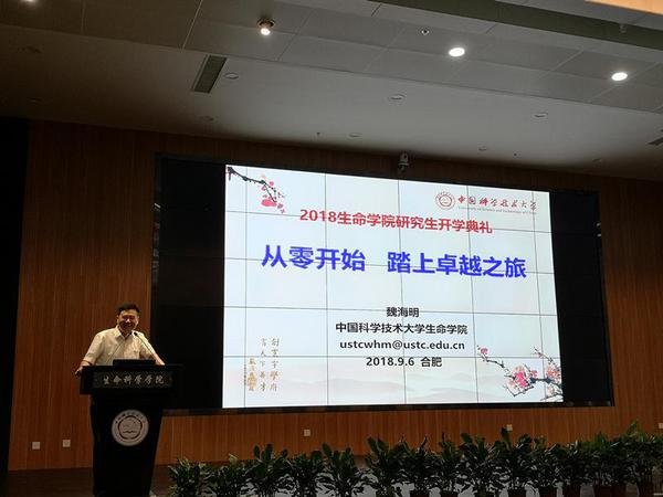 魏海明以“从零开始,踏上卓越之旅”为题做了报告,他首先总结了学院近五年来重大科研项目以及优秀的科研产出,指出这些优秀科研论文的主要贡献者正是在座各位研究生的师兄师姐们。目前学院到位经费足以支撑研究生做出优秀的成果,期望大家从零开始,踏上卓越之旅。他说,追求卓越之旅的过程是跨过一个又一个的平台,而你大多数时间都处在平台期内,可能感觉不到进步,但平台期出现和结束往往意味着将会取得更大突破。他形象地以高中、大学、研究生等不同阶段来比喻这些平台。魏海明以DNA双螺旋结构发现过程中几位重要贡献者都是25-37岁的年轻科研工作者为例,希望研究生们以年轻无畏,追求卓越之光;以HIV和丙肝的治疗药物发现为例,博学在先,创新造就英才,在追求卓越的道路上留下科大人的印记。魏海明还提示各位同学注意事项:一是尽快选课,迅速进入研究生学习状态;二是认真完成生物安全考试考核,这是生命学院研究生进入实验室和使用仪器设备的基础;三是需要认真对待科大的考试,容不得有半点作弊的心思。