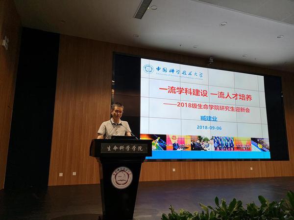 臧建业代表学院热烈欢迎2018级硕士新生来到生命科学学院。他以“一流学科建设、一流人才培养”为题,介绍了科大红专并进一甲子、科教报国六十年的办学声誉以及生命科学学院的历史沿革,新成立的生命科学与医学部的战略定位,以及附属第一医院的概况;并分别从师资队伍、科教平台、科研成果和学科建设等方向介绍了生命科学学院在人才培养、一流学科建设等方面所取得的成绩,特别是生物医学向一流学科迈进的信心和行动。随后,臧建业重点介绍了生命科学学院研究生学位点和培养方案,中期考核和转博方法,毕业及学位申请节点,以及与研究生相关的奖助系统。