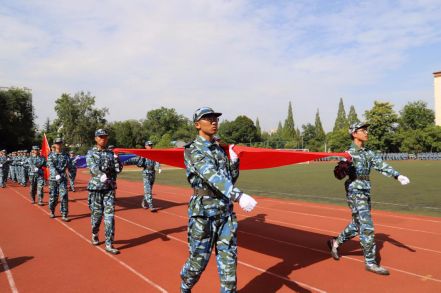 陈初升在军训团参谋长的陪同下对军训队伍进行检阅。随后,护旗手迈着稳健的步伐走在方阵的最前列,同学们向主席台致以标准的军礼表达最诚挚敬意。