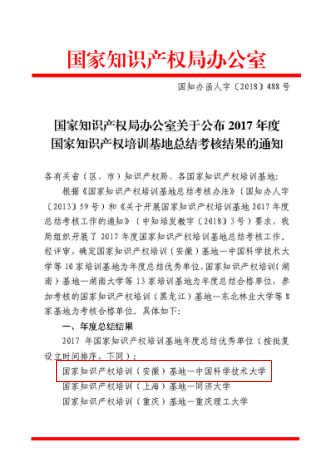 7月20日,国家知识产权局办公室关于公布2017年度国家知识产权培训基地总结考核结果的通知(国知办函人字[2018]488号),正式公布对全国23家国家级知识产权培训基地的考核结果,设立在我校的国家知识产权培训(安徽)基地确定为2017年度优秀单位。自2010年10月国家知识产权局在安徽省设立国家级培训基地以来,我校连续七年获此殊荣。