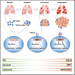 利用Kras突变自发肺癌小鼠模型,课题组证明,在肿瘤起始期,NK细胞有强大的抗肿瘤功能,可以清除大量肿瘤细胞,但是在肿瘤促进期和进展期,NK细胞逐渐丧失了抗肿瘤能力。进一步研究发现,NK细胞丧失抗肿瘤能力与其自身代谢失调密切相关,当肺癌发生后,肿瘤微环境累积大量转化生长因子-b(TGF-β),诱导NK细胞上调表达果糖-1,6-二磷酸酶(FBP1),异常表达的FBP1抑制细胞自身糖酵解代谢,同时破坏细胞存活能力,最终导致NK细胞功能紊乱。抑制NK细胞FBP1的活性,能够恢复NK细胞效应功能、存活能力和体内杀瘤能力。综上,FBP1能够通过抑制NK细胞糖酵解代谢从而削弱NK细胞功能,靶向FBP1提高NK细胞功能可以作为优化NK细胞肿瘤免疫治疗的新策略。