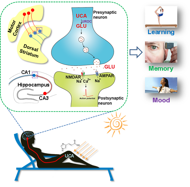 熊伟教授及黄光明教授研究团队利用自己近期开发的单细胞质谱技术(该项工作已于2017年发表在《美国国家科学院院刊》(PNAS)上),再结合神经科学的多种研究手段,发现日光照射动物皮肤后会使得血液里一种叫做UCA的化学物质含量大幅度增加。随后他们发现,增加的UCA可以透过血脑屏障进入大脑神经细胞,在细胞内UCA通过一系列的生物代谢酶最终转化成谷氨酸。细胞内的谷氨酸在运动皮层以及海马的神经末梢释放,进而激活运动学习以及记忆相关的脑内神经环路,从而增强动物的运动学习能力以及物体识别记忆能力。这是自70-80年代之后,再度发现新的脑内谷氨酸生物合成通路。由于谷氨酸在大脑内具有参与细胞内蛋白合成、能量代谢以及兴奋性神经信号传递等多种重要的生理功能,因此该通路的发现对于了解大脑工作机理以及探索相关疾病发生机制都将起到非常重要的作用。