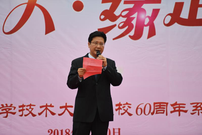 校党委副书记蒋一首先代表学校向首届校友集体婚礼活动举办表示热烈祝贺,并转达了因出差无法亲自到场的包信和校长对参加本次活动校友们的美好祝福,祝愿60对校友伉俪同心同德幸福长,也藉此机会祝愿每一位科大校友都能事业有成、阖家幸福,母校随时欢迎校友们常回家看看。