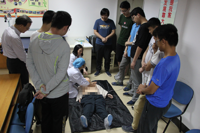 在实践模拟训练阶段,由四组医护人员分别用四个心肺复苏模拟人为同学们进行CPR实战讲解和演示。