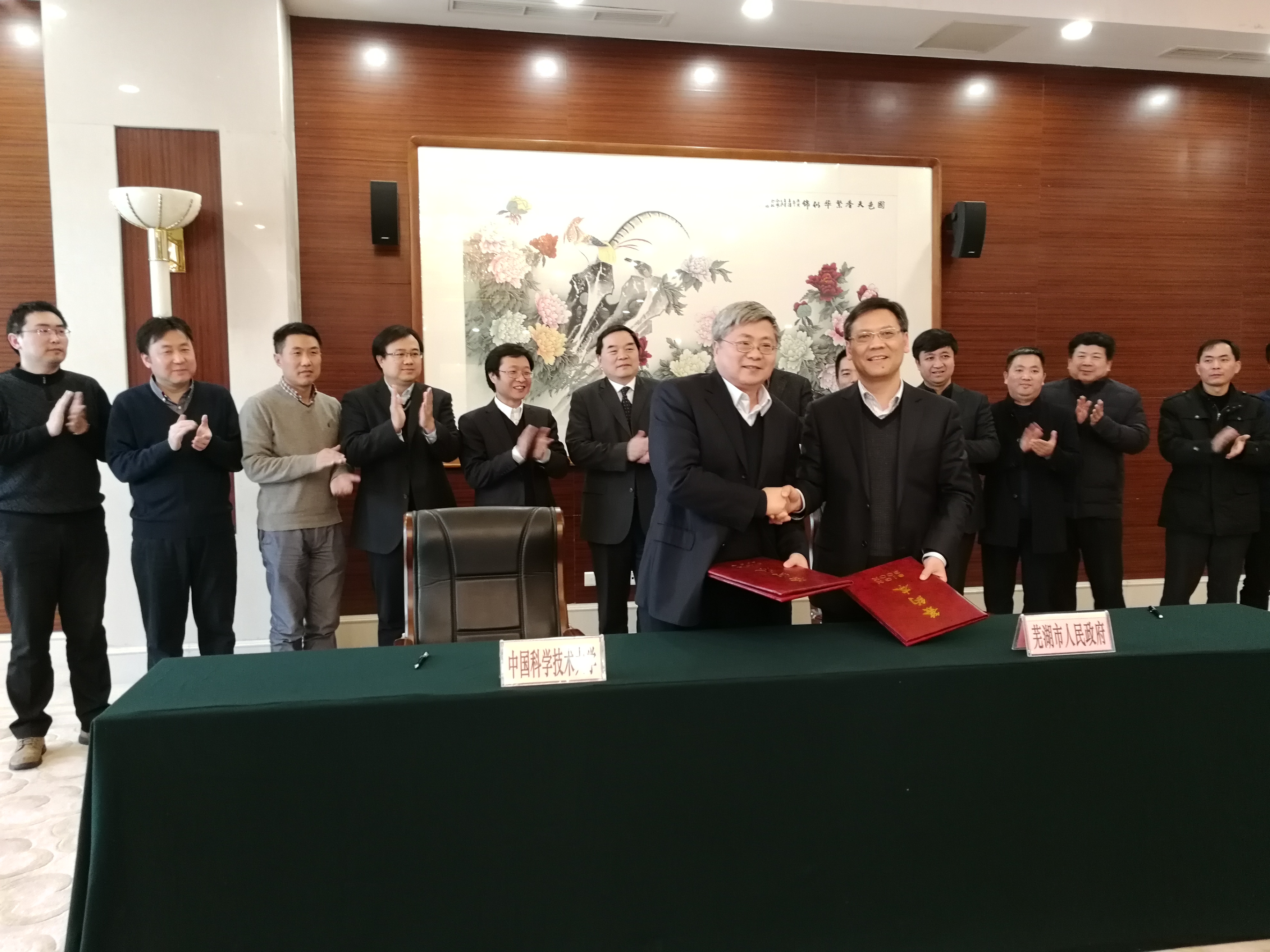 1月28日,学校与芜湖市政府签订框架协议,共同建设智慧城市实验室,开展大数据和智慧城市创新研究,推进智慧产业发展和芜湖市智慧城市建设。校长包信和,芜湖市委书记潘朝晖、市长贺懋燮出席会议,副校长朱长飞、芜湖常务副市长冯克金代表双方签约。