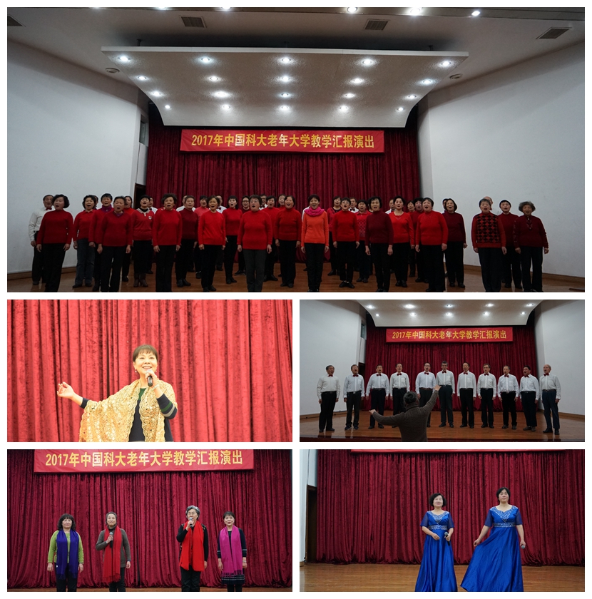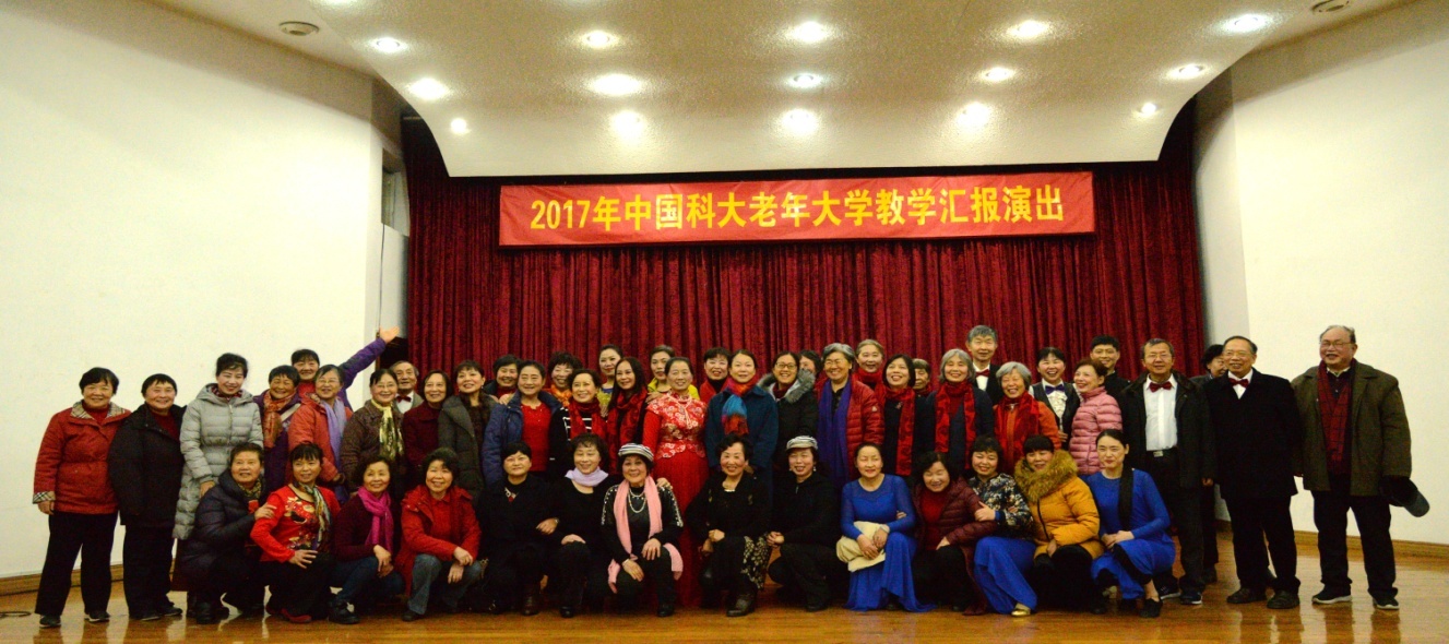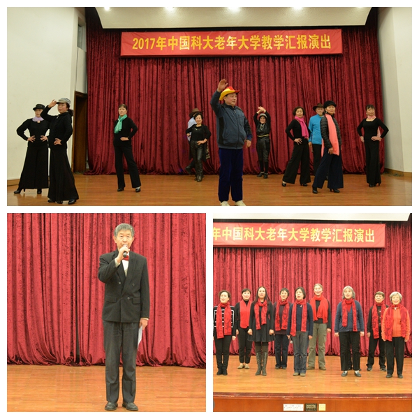 12月18日下午,中国科大老年大学、中国科大离退办在东区水上报告厅举办2017年度科大老年大学教学汇报演出,整场演出共13个节目,均是老年大学歌咏班、舞蹈班、时装表演班、国标舞班、太极班、诗词班、英语口语班等班级的学员们自编自演,节目涵盖歌唱、舞蹈、诗朗诵、太极表演、时装表演、相声等多种艺术形式,为台下200余名观众带来了一场温馨的视听盛宴。