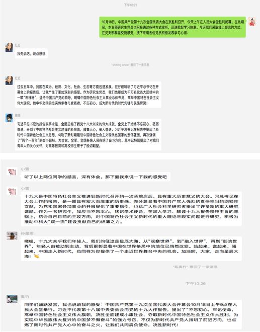 10月24日十九大闭幕当天,该支部21名学生党员在线上作交流发言,结合学生实际积极谈认识、谈体会、谈思想、谈打算。大家表示,十九大再一次明确了中国共产党人的初心和使命,明确了我国社会主要矛盾的变化,我们一定要把十九大报告学习好、领会好、贯彻好,自觉用习近平新时代中国特色社会主义思想武装头脑,进一步增强“四个意识”、坚定“四个自信”,坚决维护党中央权威,坚决服从党中央集中统一领导,紧密团结在以习近平同志为核心的党中央周围,迈入新时代、开启新征程、续写新辉煌。青年强则国强,作为青年学生,更应牢记习总书记嘱托,不忘初心,继续前进,为国家早日实现第二个百年奋斗目标而不懈努力。