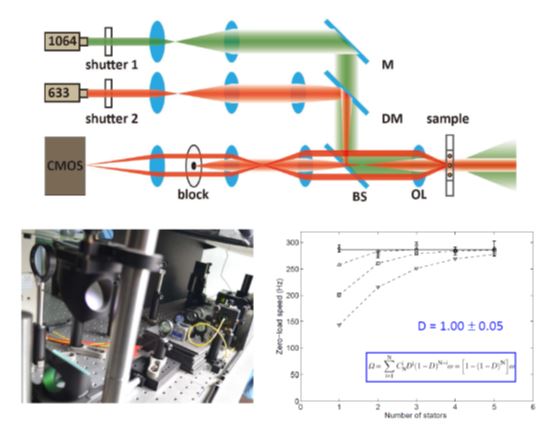 激光暗场+光镊+明场光路设计简图(上);光路局部实物图(左下);测量结果表明马达定子占空比是1(右下)。