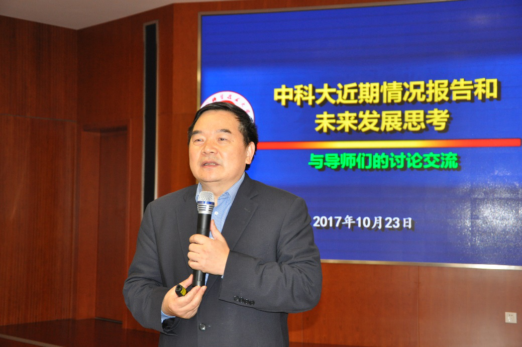 最后,校长包信和院士作了题为《中国科大近期情况报告和未来发展思考》的专题报告。报告从学校近期情况、“双一流”和“四个率先”背景下学校发展思考、“双一流”建设任务和要求、人才培养和立德树人、学科建设和科学研究、校区功能优化和校园建设、科大六十年校庆等七个方面展开。他在深入分析我校发展所处的大背景和面临的机遇与挑战的基础上,重点介绍了未来一个时期内我校“双一流”建设、人才培养的基本思路。