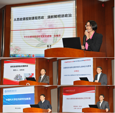 随后,研究生院副院长古继宝作了题为《中国科大学位与研究生教育》的报告,从学科建设、学术学位、专业学位、科教结合四个方面介绍了我校学位研究生教育工作的整体情况。研究生院副院长倪瑞作了题为《学位与研究生教育信息化工作介绍》的报告,阐述了信息化环境下我校学位与研究生教育由管理向服务转变的理念。