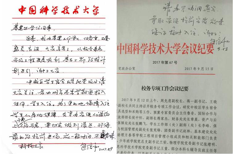 包信和校长高度重视园区规划和建设工作,多次到施工现场考察物质科学教研楼、中校区学生宿舍楼、学生生活服务中心、综合体育中心、动力保障站房等在建项目,了解项目建设进展,看望工程建设和项目管理人员,并就推进有关工作作出指示和批示。2017年6月22日,包校长到中校区和东校区调研园区规划和建设工作时指出,我们要抓住学校六十周年校庆的宝贵机遇,立足长远、前瞻布局,积极争取安徽省、合肥市等各方面的支持,努力开拓学校事业发展和园区建设的新局面。8月9日,正值学校暑期基本建设和维修改造项目热火朝天推进之际,包校长专门致信学校基本建设处,对大家的辛苦工作表示肯定和感谢,并就中校区学生宿舍及其配套项目明年春季学期投入使用提出具体要求,强调在中校区学生宿舍家具采购工作中要切实做到绿色、环保,保障入住学生的身体健康。9月18日,包校长在校务专项工作会议纪要上作出批示,要求加紧协调落实中校区学生宿舍家具采购和安装工作,保证按时入住。