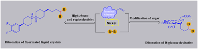 傅尧教授领导的团队针对偕二硼化合物的高效合成,发展了一种镍催化末端烯烃的双硼化新反应,该反应以廉价易得的烯烃为原料,经连续的选择性硼化和氢硼化过程即可高效地制备偕二硼化合物,研究发现该反应具有较高的化学选择性和区域选择性,以及较好的官能团兼容性,能够用于复杂分子的修饰合成,例如可以用于含氟液晶材料分子合成及D-葡萄糖衍生物的侧链修饰等(图1)。此外,该反应还实现对低碳烯烃进行双硼衍生化反应,例如常压下可顺利实现乙烯、丙烯的双硼衍生化。