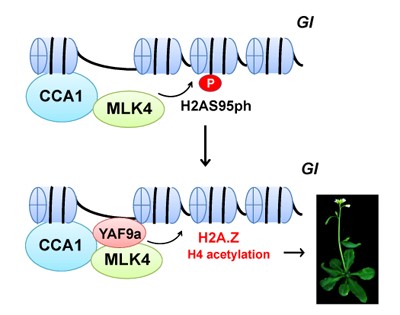 在长日照的情况下,功能缺失的mlk4突变体具有晚花的表型;而在短日照的情况下,没有明显的表型,表明MLK4参与了光周期途径。研究发现:MLK4能与MYB类转录因子CIRCADIAN CLOCK ASSOCIATED 1 (CCA1)相互作用,CCA1可以将MLK4直接带至GIGANTEA (GI)基因上,完成组蛋白H2A的95磷酸化,并且MLK4能促进GI的表达水平。经点突变的MLK4失去激酶活性,则不能互补mlk4突变体晚花的表型,表明组蛋白H2A的95磷酸化能够促进拟南芥的开花时间,以及世代交替过程。