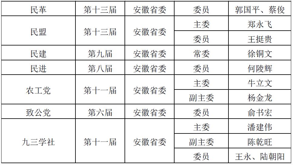 学校党委高度重视民主党派换届工作,主动加强与安徽省委统战部、民主党派省委的沟通,切实做好我校优秀民主党派人士的推荐工作,并积极配合各民主党派省委完成对相关候选人的考察工作。在本次换届中,我校一批政治素质高、群众基础好、参政议政能力强的党外代表人士进入了民主党派省委会,为他们自身发展和作用发挥提供了更广阔的舞台。