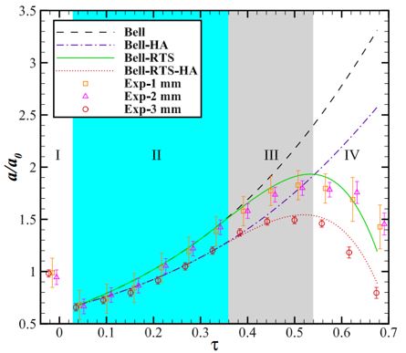 汇聚激波冲击下扰动振幅随时间的变化规律:符号代表不同初始振幅的实验结果,虚线为Bell理论曲线,点划线为大振幅修正后的Bell理论曲线,实线为考虑Rayleigh-Taylor效应的Bell理论曲线,点线为大振幅修正后考虑Rayleigh-Taylor效应的Bell理论曲线。I:激波压缩阶段;II:加速增长阶段;III:减速增长阶段;IV:振幅衰减阶段。