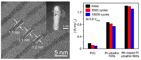 面对这一挑战,研究人员在通过调节铂基催化剂的维度来改变对称性和与碳负载的接触面积的同时,引入铑原子增强其稳定性。铑原子掺杂铂超细纳米线的直径仅有1.3纳米,其铂原子利用率高达48.6%。碳负载的铑原子掺杂铂基超细纳米线的质量活性和比活性分别达到了商用铂碳催化剂的7.8倍和5.4倍,同时该催化剂在氧气气氛下循环使用10000次后,只有9.2%的质量活性性能损失,而与之相对的商用铂碳催化剂在氧气气氛下循环使用10000次后,质量活性性能损失达到72.3%。