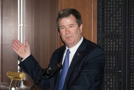 在启动仪式上,华盛顿大学副校长Jeffrey Riedinger代表华盛顿大学致辞,首先对两校成功合作表示热烈祝贺。他说,华盛顿大学是一所在全球范围内积极展开合作的大学,在2017年US News世界大学排名中位于全球第11名。他表示,欢迎中国科大将USTC-UW全球商业与金融创新研究所设在华盛顿大学,学校将大力支持研究所的建设,承诺在新的麦肯锡大楼落成之后,研究所办公室、实验室将安排在这栋全新的大楼中。