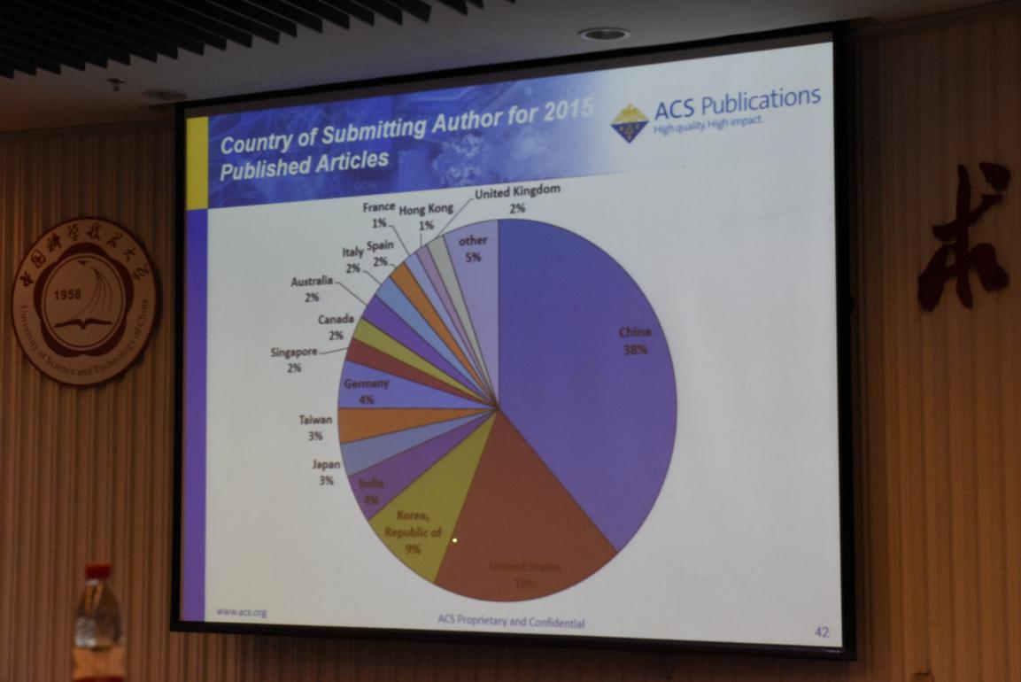作为美国化学会期刊ACS Applied Materials & Interfaces(2015-2016IF=7.145)的创刊主编,Schanze教授介绍了期刊近年来的发文统计、引用率等基本情况,并表示中国近年来的科研水平快速上升给他留下了深刻的印象。ACS AMI对中国的研究工作相当友好,从对ACS AMI投稿量来看,中国已经稳居第一位,并且是投稿量第二位美国的两倍。中国科大作为中国化学科研领域的领先单位,在期刊ACS AMI的发文量在全球机构内排名第七。