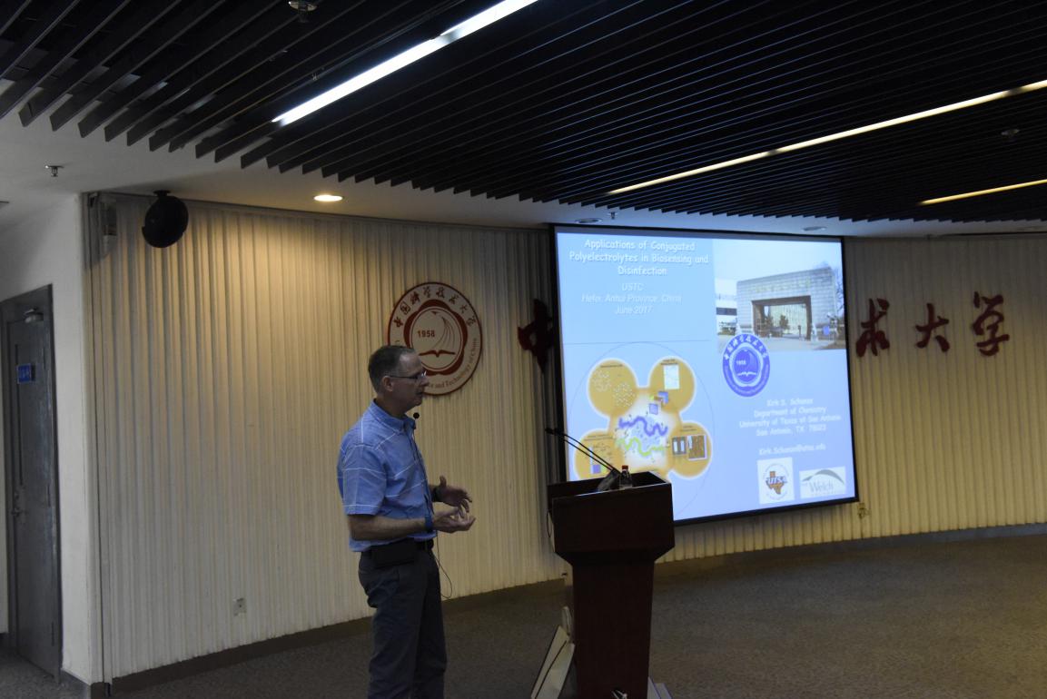 应微尺度物质科学国家实验室张国庆教授的邀请,美国德克萨斯大学圣安东尼奥分校化学系教授、ACS Applied Materials & Interfaces杂志主编Kirk S. Schanze教授日前来科大交流授课,并于6月8日在微尺度一楼报告厅做了题为Applications of Conjugated