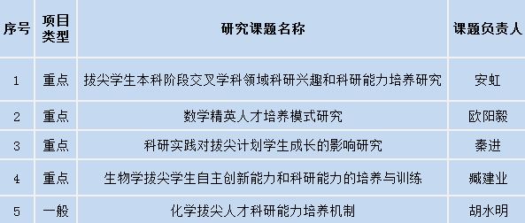 本次“拔尖计划”研究课题于2017年1月中旬启动申报,在教务处精心组织和各主管学院的共同努力下,我校于3月上旬完成了推荐申报工作。经过“拔尖计划”工作组秘书处组织专家对申报的69项项目进行评审,共有44项课题通过评审,其中重点课题13项、一般课题31项。我校推荐申报的“拔尖学生本科阶段交叉学科领域科研兴趣和科研能力培养研究” 、“数学精英人才培养模式研究”等5项课题获批立项,其中重点项目4项,一般项目1项,获批项目数名列入选高校第二(详见附表)。