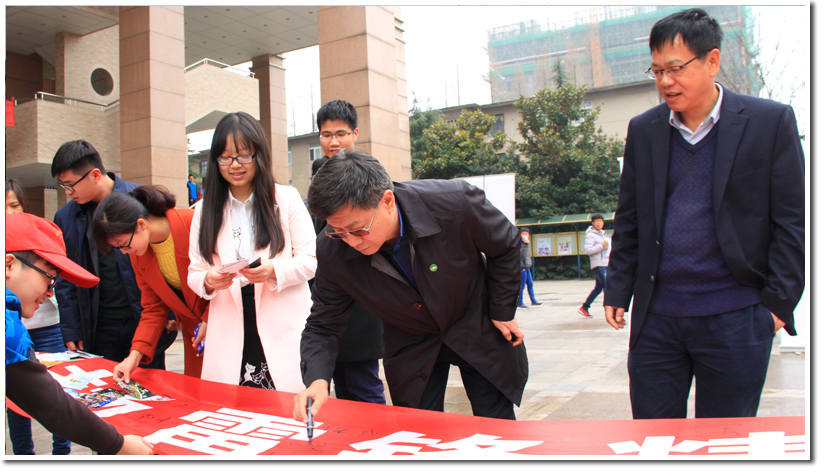校党委书记许武来到活动现场,对同学们积极参与社会实践和志愿服务活动,不忘初心、践行雷锋精神的行为表示赞许,并在“弘扬雷锋精神 青春志愿同行”的条幅上签名。