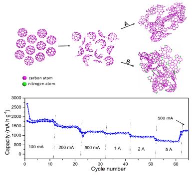 朱彦武教授团队前期通过氢氧化钾活化微波剥离的氧化石墨烯,制备出性能优异的超级电容器碳电极材料(Science 2011, Advanced Materials 2016)。基于前期工作基础,该团队通过活化具有确定尺寸和结构的纳米碳单元——富勒烯,得到了具有良好导电性并兼具高比表面积的多孔碳。实验发现,当使用比较高比例的氢氧化钾进行处理时,剧烈的活化过程可以打破富勒烯分子,得到碳量子点(Scientific Reports 2015)。当对这一过程进一步优化,并在活化过程中通入氨气,可制备出不同掺氮量的掺氮多孔碳。如上图所示,由于富勒烯本身兼具五元环和六元环碳结构,最后制备出的掺氮多孔碳中氮的主要形式为吡啶氮和吡咯氮,而且其中吡咯氮为主要成分。计算结果表明,由于五元环造成的曲率结构对锂离子的吸附能力相对于石墨烯平面结构更大,同时吡咯氮和吡啶氮特别是吡咯氮大大增加了对锂离子的吸附能力。材料的高比表面积和大量拓扑缺陷使其体现出优良倍率性能。