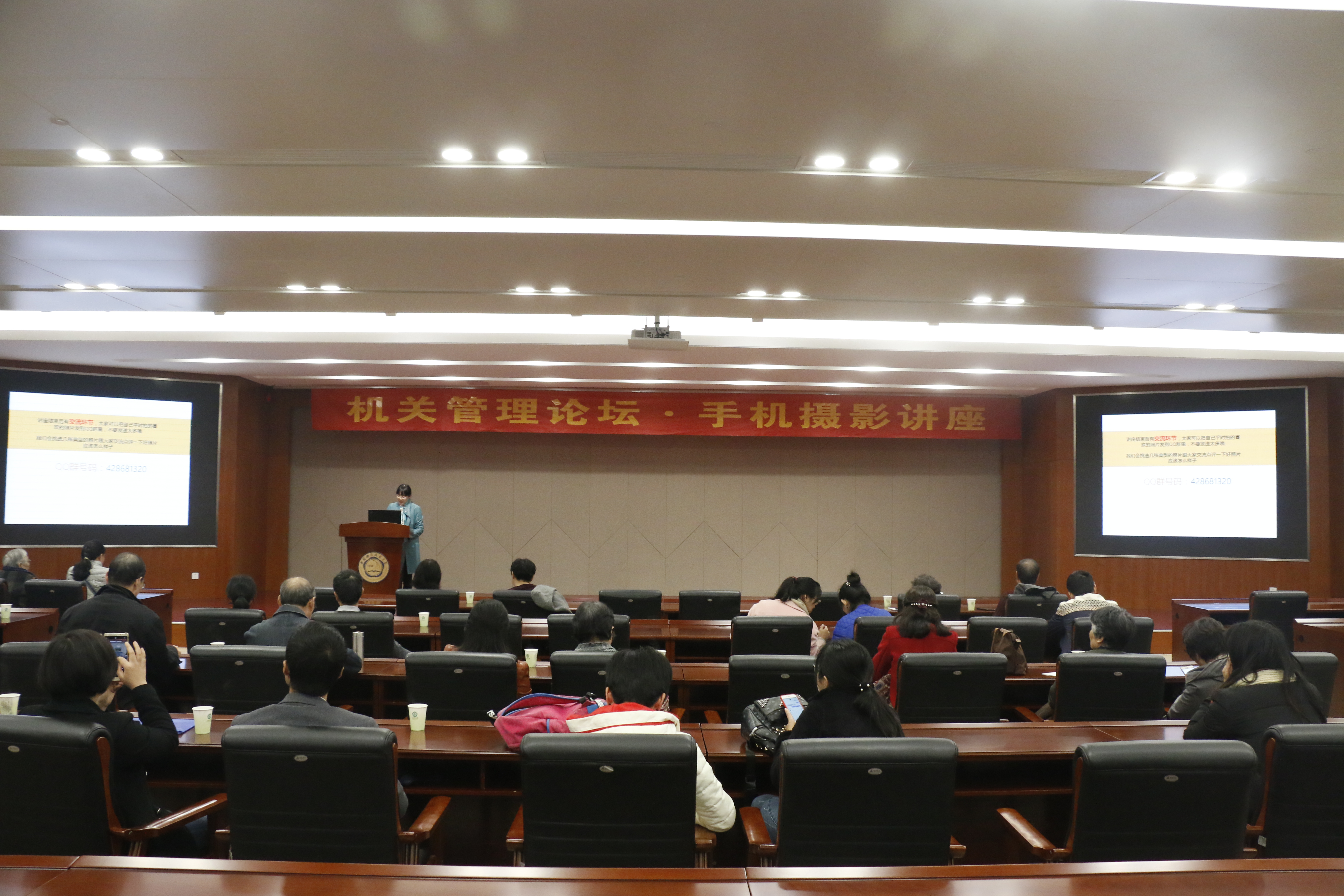 时下,手机已经成为人们不可或缺的生活工作工具,随时随地用手机摄影已成为人们的生活乐趣和工作组成部分。为丰富机关教职员工业余生活,熟练掌握手机摄影技巧,11月17日下午,机关党委在东活五楼报告厅组织机关管理论坛•手机摄影讲座,邀请中国科大全媒体中心摄影部摄影师——2014级化学与材料科学学院环境工程系研究生杨传旺同学作专题讲座。讲座由机关党委副书记郑红群主持,机关管理人员、感兴趣的师生80多人听取了讲座。