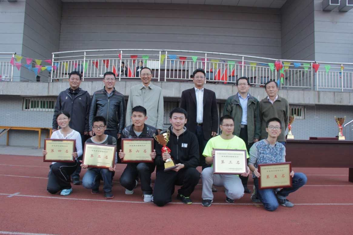 最终,物理学院代表队获得本届体育运动大会学生团体总分第一名,二至六名分别为火灾科学国家重点实验室、信息科学技术学院、生命科学学院、少年班学院和数学科学学院;获得教工组团体总分第一名的是校机关代表队,幼儿园、后勤联队、化学与材料科学学院、信息科学技术学院和生命科学学院分获二至六名。