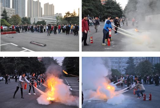 讲座结束后,保卫与校园管理处副处长张宪锋作了应急疏散要点说明,并指导大家开展火灾疏散逃生演习。当大家疏散到开阔地带后,开始进行灭火器使用演习。保卫与校园管理处工作人员介绍了扑救初起火灾的意义,现场向大家演示了灭火器的使用方法,并指导大家依次上前使用灭火器扑灭油槽中的火焰。参演师生兴致勃勃,取得了很好的演练效果。