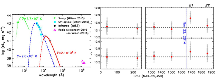 ASASSN-14li是2014年底发现的目前距离我们最近(约90 Mpc)最亮、也是目前研究最细致的TDE。国际上,关于它的X-射线波段的一项研究发表在Nature上;关于它的射电波段的一项研究发表在Science,另有关于这个源的十几项研究工作发表在ApJ等国际权威杂志上。王挺贵教授在ASASSN-14li被发现伊始就提醒小组成员关注这一目前最近也是最亮的TDE, WISE最近释放了它最新的数据,窦立明提出可以利用它的测光曲线,蒋凝等人迅速把这一想法实现。此前,没有任何关于TDE的红外回响的可靠观测证据,可以说该工作初次打开了TDE研究的红外窗口。该工作发表后,已有多篇SCI引用。该小组与美国小组的研究工作几乎同时出现,说明这一研究领域竞争十分激烈。王挺贵小组投稿和正式发表时间稍早一些,并且红外回响信号更为可靠。他们在红外两个波段均看到明显的回响信号并给出了尘埃的温度和质量,而Sjoert van Velzen等人只在一个波段看到较微弱的信号,不能估计尘埃的温度和质量。