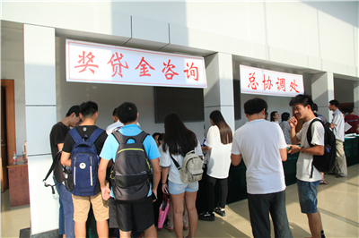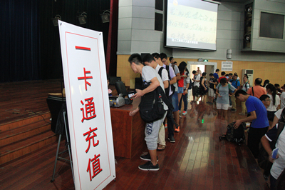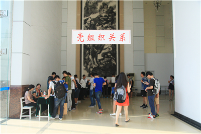 研究生新生报到集中在东区大礼堂进行,总协调处、党组织关系、缴费处、奖贷金咨询、各院系报到处、户籍迁移办理处等地点标志醒目、秩序井然,总协调处的屏幕上实时动态显示着新生注册的统计情况。