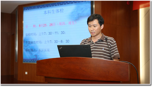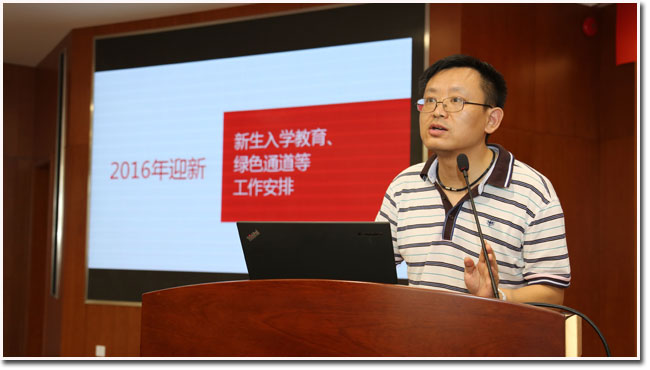 会上,招生就业处副处长、招生办公室主任韦巍巍介绍了本科生招生情况;学生工作部(处)长董雨介绍了迎新工作总体安排;学生工作部(处)副部(处)长李峰介绍了新生入学教育和“绿色通道”工作;学生工作处心理教育与咨询中心主任沈克祥介绍了新生心理普查及家庭经济状况调查;保卫与校园管理处章仲楷介绍了新生住宿安排情况;校医院副院长周鹏介绍了新生体检及医疗保险事宜;网络信息中心兰宇介绍了“一卡通”办理、发放事宜;金智公司工作人员介绍了迎新网站的使用;图书馆樊亚芳介绍了图书馆新生培训有关安排。