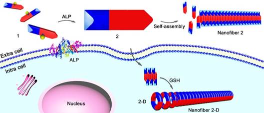 肿瘤细胞内部通常是一个还原性的环境,存在高达毫摩尔量级的谷胱甘肽(GSH)。肿瘤细胞外部存在大量细胞分泌的磷酸酯酶。利用这种差异,梁高林课题组设计出一种生物兼容的多功能小分子水凝胶前驱体。该小分子的磷酸根在胞外的磷酸酶的作用下被切除,引发第一级自组装形成线性纳米纤维(见下图)。而当这些小分子进入细胞内部时,由于GSH的存在,小分子上的双硫键被GSH还原,从而露出半胱氨酸上的巯基硫醇结构。裸露的氨基硫醇结构又可以和小分子结构中的氰基苯并噻唑发生高效的点击缩合反应,生成环状的二聚体。由于π-π堆积作用,该二聚体分子之间会相互吸引,引发第二级自组装形成环状的纳米纤维(见下图)。该小分子水凝胶前驱体的“一石二鸟”设计的实现,是梁高林教授发现并推广的新型点击缩合反应(半胱氨酸和氰基苯并噻唑之间的反应)的又一成功应用。