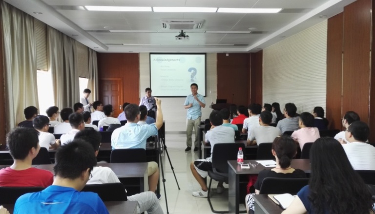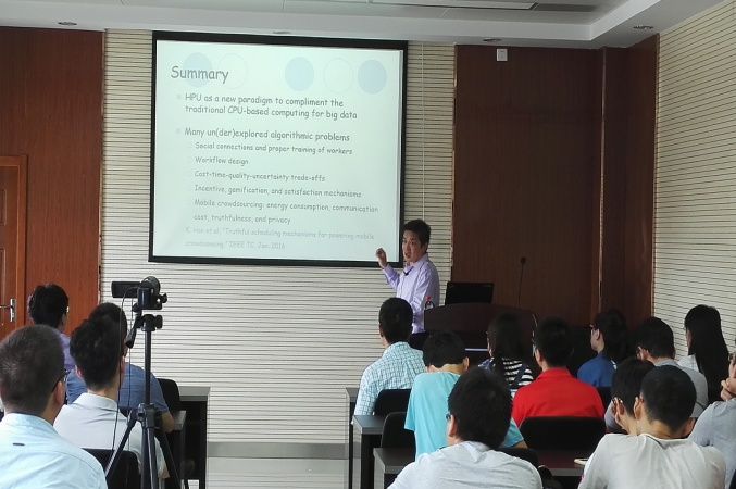 会谈结束后,Wu Jie教授一行前往计算机学院,与执行院长李向阳教授进行了会谈。双方交流了计算机学科的办学经验,并就未来的交流合作畅谈了构想。随后,Wu Jie教授为计算机学院师生做了题为“Algorithmic Crowdsourcing: Current Status and Future Perspective”的学术报告。他通过几个精彩的应用实例,深入浅出地介绍了“Crowdsourcing(众包)”的基本概念、最新研究进展和发展趋势,还就人机智慧等热点话题与同学们进行了深入探讨,引起了与会师生的极大兴趣。