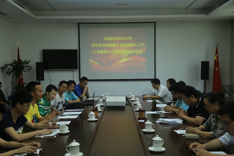 会上,与会老师和支教队员围绕物资募集、服务项目、工作提升、科大特色传承等方面进行了深入交流,提出了很多有价值的意见和建议。与会老师勉励支教队员们脚踏实地地做事,并为即将出征的第十八届支教队壮行。