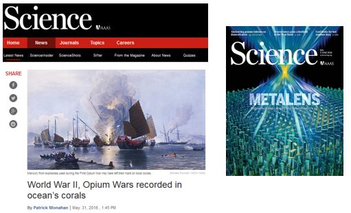 该研究一经发表,便吸引了国际媒体的关注。同期《科学》杂志Science News以 “World War II, Opium Wars recorded in ocean’s corals”为题详细报道了该研究发现,并对本文的主要作者进行视频专访,同时还邀请了国际该领域相关的科学家就本研究进行了广泛的讨论,整个报道有三页篇幅。来自哈佛大学的大气化学家Horowitz博士受邀在美国科学杂志评价本工作时说:“该发现为研究历史时期大气汞的行为提供了新的视角,过去一直认为汞在大气中是一个长距离传输的元素,其大气滞留时间达到一年甚至更长的时间,而现在正考虑把这个时间修改到月的级别”。