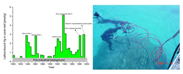 珊瑚碳酸钙骨骼在形成的过程中,海水中半径类似的汞离子能够取代钙离子,以类质同相的形式进入到珊瑚骨骼晶体中。研究者通过复杂的化学流程,从海南岛龙湾地区生长200年的珊瑚礁中分离出珊瑚骨骼中的“晶格结合态汞”,然后利用微量汞纯化、分析技术准确测得了不同年份珊瑚骨骼中“晶格结合态汞”的含量。他们发现,在过去200多年间,珊瑚中汞的含量出现多个短暂而明显的峰值:除了1980和1990年区域的峰值可能与中国南方沿海的工业化和城市化有关外,其余几个峰值与第一次鸦片战争、第二次鸦片战争、第二次世界大战等重要的战争在时间点和战争规模上非常吻合。他们通过查阅相关历史资料和文献发现,硝酸汞在19世纪初就开始大量应用到军火和炸药的生产中,海战时使用的弹药可能会向大气中排放大量的汞。在海洋和大气接触面上,海水可以通过“sea spray”作用, 释放大量的卤素自由基,从而快速氧化大气中的汞,使其快速沉降到海洋中。沉降到海洋中的溶解态汞,进一步通过珊瑚的钙化作用进入到珊瑚的晶格中,从而留下了永久的印记。