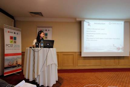 论文"Einstein vs. Newton: the historical influence of great scientists based on big data analysis",基于谷歌图书大数据对科学家历史影响力进行定量探索,获得Poster组报告竞赛第一名,并直接被邀请参加2018年第15届PCST新西兰年会;论文"Practice and quantitative study on visualization of cutting-edge science"和"Cover image of Science: research on 56 years history of development",为前沿科学成果视觉化定量研究系列报告,受邀在Ethics and arts和Media practices分会场上进行报告发言,并引起了同行学者的较大兴趣。