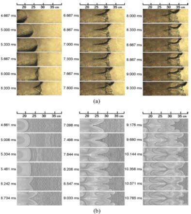 图1 氢/空气预混火焰传播微观过程的高速纹影图片与数值模拟