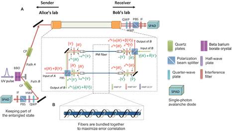 李传锋、许金时等人选择保偏光纤进行深入研究。保偏光纤具有极强的相位消相干,能否利用它来有效地传输量子信息是个问题。研究组利用量子通讯领域最近发展的理论工具来刻画光纤的信道容量。他们首先实验测定单根120米左右长度的保偏光纤的量子容量为零,也就是说一次性使用单根保偏光纤是不能传输量子信息的,这是消相干太强导致的必然结果。接下来他们对两根相同的保偏光纤进行编码,构成一个量子信道干涉仪,从而把量子容量为零的保偏光纤激活。激活后两个保偏光纤将不再独立,而是相互关联起来构造出一个无消相干子空间,从而有效地进行量子信息传输。为了提高光纤噪声的关联度,实验中他们将两根光纤缠绕在一起。实验测得两根量子容量为零的保偏光纤联合使用时的量子容量大于0.6。量子信道干涉仪内有两个输入口和两个输出口,通过改变干涉仪内半波片的设置,可以实现量子信息在噪声信道中的单向传输或双向传输。他们还进一步验证了量子纠缠在这种装置下传输的可靠性。