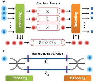 标准量子信道理论(A)与干涉激活技术(B)的对比。(A)编码以后每个光子经过一个信道或者光子一个接一个经过一串信道。(B)编码后一个光子同时经过两个信道。